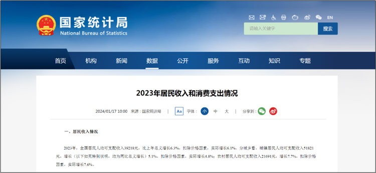 2023年,全國(guó)居民人均可支配收入39218元,比上年名義增長(zhǎng)6.3%,扣除價(jià)格因素,實(shí)際增長(zhǎng)6.1%。分城鄉(xiāng)看,城鎮(zhèn)居民人均可支配收入51821元,增長(zhǎng)(以下如無(wú)特別說(shuō)明,均為同比名義增長(zhǎng))5.1%,扣除價(jià)格因素,實(shí)際增長(zhǎng)4.8%;農(nóng)村居民人均可支配收入21691元,增長(zhǎng)7.7%,扣除價(jià)格因素,實(shí)際增長(zhǎng)7.6%。