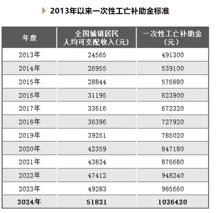 2024年1月17日上午10點(diǎn),根據(jù)國(guó)家統(tǒng)計(jì)局公布的最新數(shù)據(jù),2024年度一次性工亡補(bǔ)助金標(biāo)準(zhǔn)確定: 51821×20=1036420元